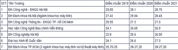 Trường Đại Học Kinh tế Quốc dân có mức điểm chuẩn ngành Công nghệ thông tin năm 2021 tương đối cao là 27,3 điểm.Nhiều trường đào tạo chuyên ngành công nghệ thông tin ở khu vực phía Nam năm 2021 cũng lấy điểm chuẩn rất cao.