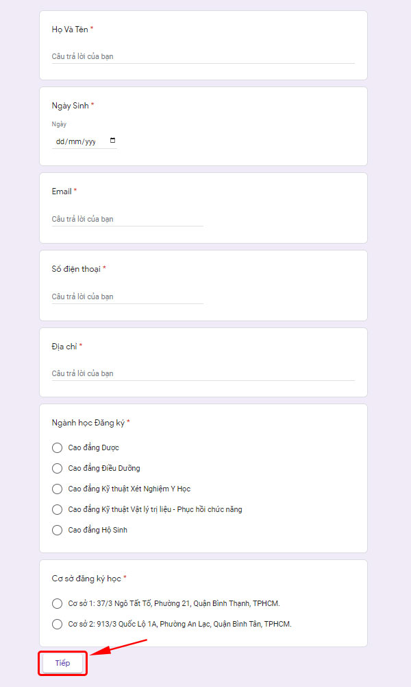 - Tại mục này thí sinh điền đầy đủ thông tin: Họ và tên, ngày sinh, Email, số điện thoại, địa chỉ, ngành học đăng ký ( gồm Cao đẳng Dược, Cao đẳng Điều Dưỡng, Cao đẳng Kỹ thuật xét nghiệm Y học, Cao đẳng Kỹ thuật vật lý trị liệu – Phục hồi chức năng, Cao đẳng Hộ sinh), cơ sở đăng ký học ( em được chọn cơ sở học tại Bình Thạnh hoặc Bình Tân). Sau đó bấm nút “Tiếp” để thực hiện sang bước thứ 2.