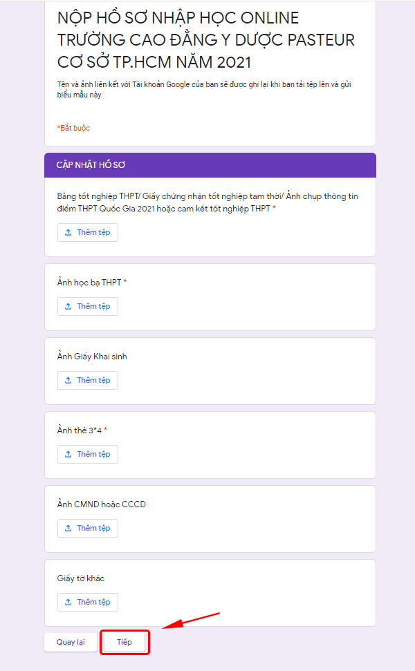 - Thí sinh bấm “Thêm tệp” và chọn đúng ảnh cần gửi, sau đó bấm “Tải”. Sau khi tải tất cả ảnh lên thí sinh bấm nút “Tiếp” để thực hiện sang bước thứ 3.