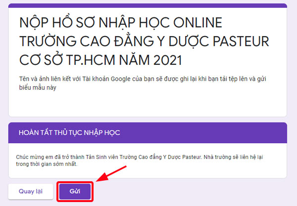 - Ở bước này thí sinh chỉ cần bấm “Gửi”. Lúc này thí sinh đã hoàn tất thủ tục nhập học trực tuyến.