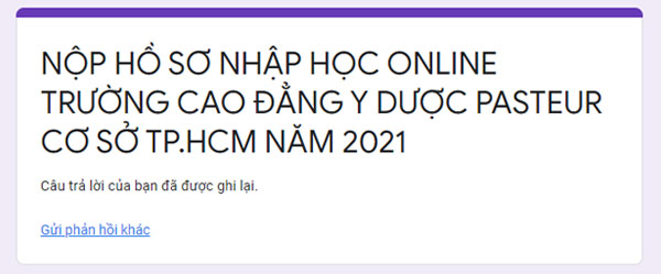 Khi đã hoàn tất 4 bước ở trên là thí sinh đã hoàn tất thủ tục nhập học trực tuyến và chính thức trở thành tân sinh viên của Trường Cao đẳng Y Dược Pasteur. Sau thời gian này, nhà Trường sẽ thông báo cụ thể đến các bạn tân sinh viên về thời gian nộp hồ sơ nhập học trực tiếp tại trường để bổ sung các loại giấy tờ cần thiết.