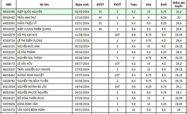 Theo tin tức tuyển sinh trong số 276 em thí sinh trúng tuyển ngành này thì có 18 thí sinh đạt từ 29 điểm trở lên, thí sinh có tổng điểm xét tuyển cao nhất là em Diệp Quốc Nguyên với 30,2 điểm, được biết năm nay Trường Đại học Y dược TP.HCM có 2.577 thí sinh trúng tuyển theo phương thức xét điểm thi tốt nghiệp THPT, trong đợt công bố vừa qua điểm chuẩn vào trường năm nay ở mức từ 19,05 điểm đến 27,55 điểm.